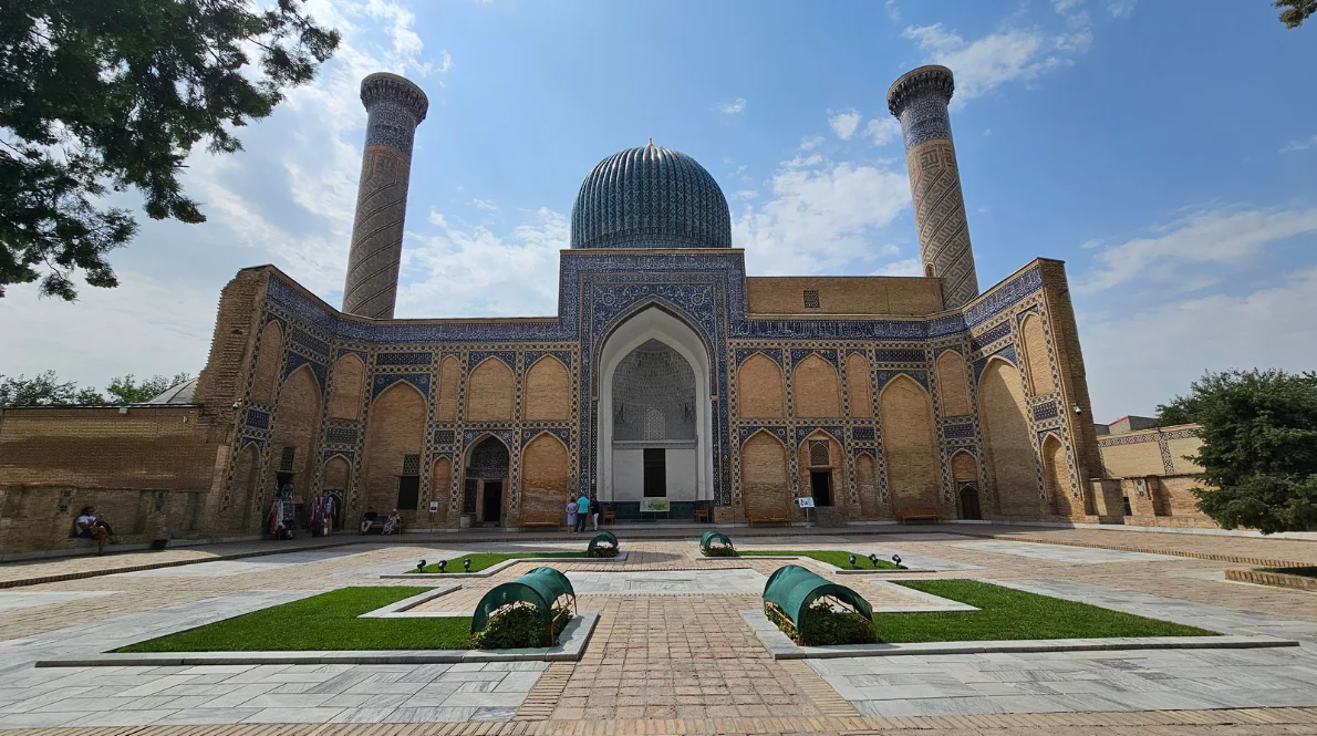 El mausoleo de Gur-e Amir < Tumba del Emir > fue construido en 1403 en honor al nieto favorito de Amir Temur, llamado Muhammad Sultan. Fue la cripta dinástica de los timúridas. Bajo la cúpula azul, con 64 nervaduras, se encuentran las tumbas de Temur, su tercer hijo Miranshah, su cuarto hijo Shokhruh, su nieto Muhammad Sultan, Ulugbek, su mentor espiritual Mir Said Baraka y, más tarde, también fue enterrado Said Omar. El interior fue decorado con papel maché. Alrededor del mausoleo se pueden ver las ruinas de la antigua madraza y la khanaka (para derviches). La entrada fue construida posteriormente, en 1422, por Ulugbek.